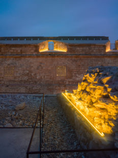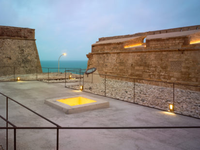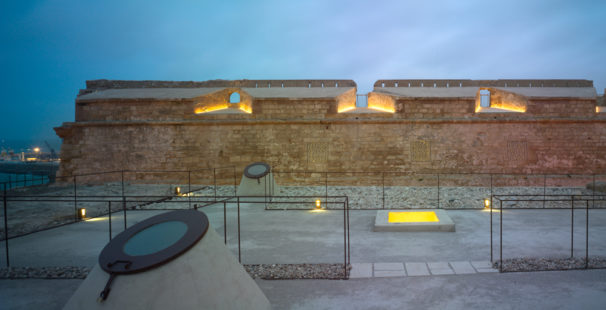Una pieza mas del sistema defensivo del Cuarto Recinto Fortificado de Melilla…. Mediante cuidadas proyecciones de luz, aparecen en escena, algunos elementos defensivos como son los caballos de Frisia, estadas o fogatas, realizando continuas llamadas de atención al observador que comienzo sin querer a transportarse a tiempos pasados. A través de los restos arquitectónicos fusionados con la iluminación se explica el resto de defensas (garitas, restos de fortificaciones, y obstáculos)