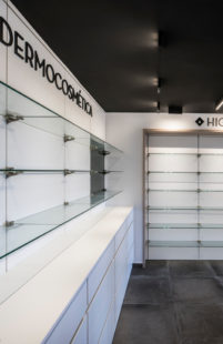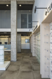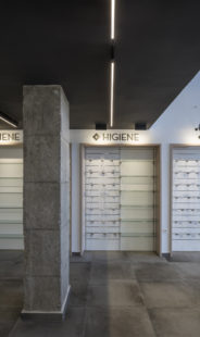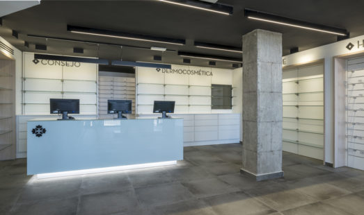 Farmacia Villarroel ubicada en la Ciudad de Melilla donde se pretende integrar la iluminación con la arquitectura y con las limitaciones de altura del espacio, se utilizan luminarias fabricadas a medida, conjugadas con luminarias de distribución asimétrica para la iluminación vertical de ventas protegiendo al usurarios de los deslumbramientos directos producidos por luminarias orientables convencionales.